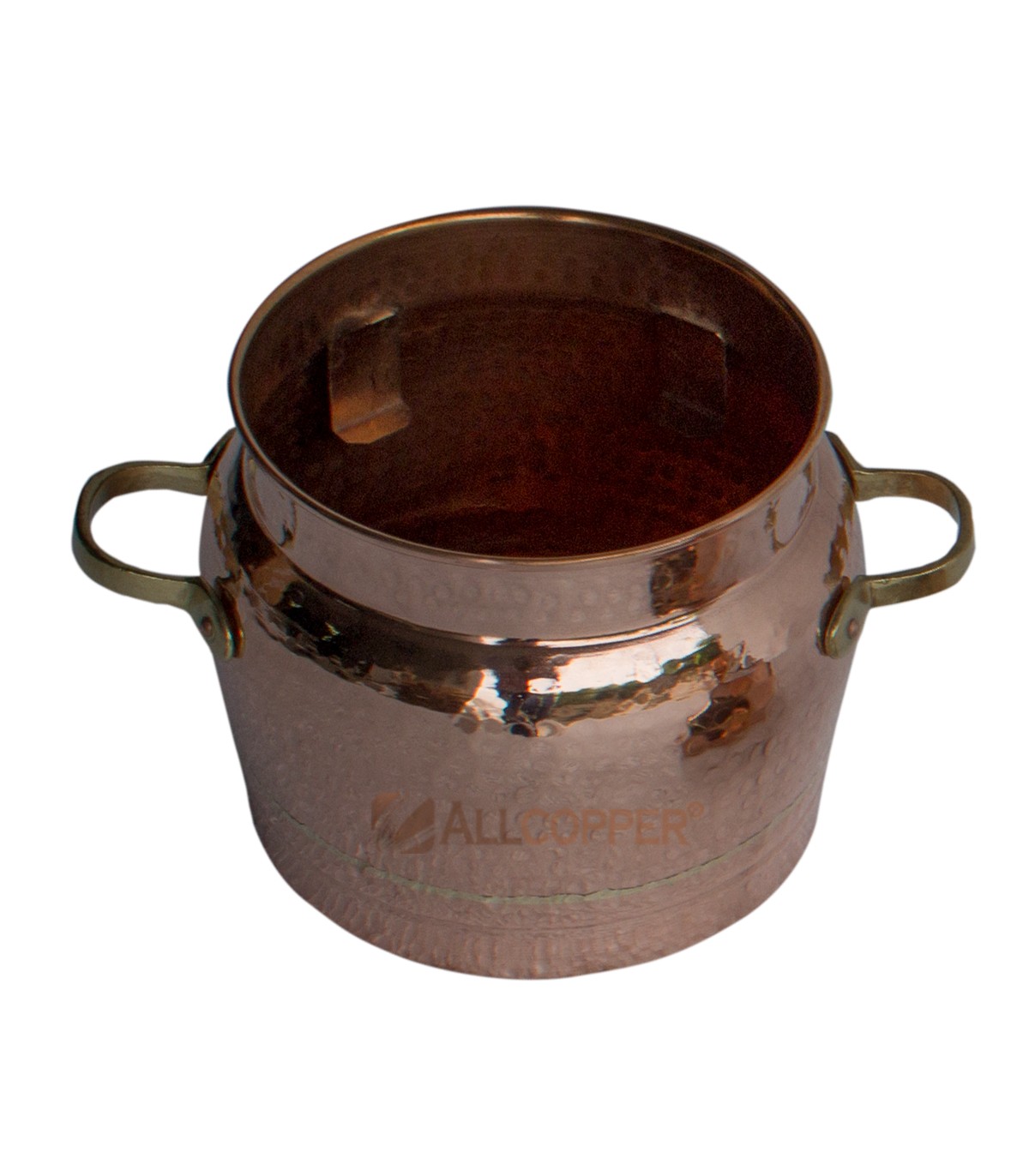 Alquitar Classique, faite à la main. Le alquitar diffère de l'alambic traditionnel dans la conception, en prenant moins d'espace, ce modèle est une évolution relativement au modèle classique, car il permet une augmentation de la capacité de la distillation à la vapeur parce qu'il a intégré en augmentation entre la chaudière et la tête.