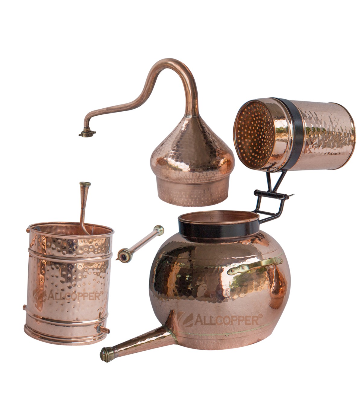 Este alambique está equipado com a caldeira,coluna rotativa unida à caldeira com um suporte de metal,que pode ser removida de pretender usar o alambique à maneira tradicional,  capacete,  tubos de extensão e condensador com serpentina.
